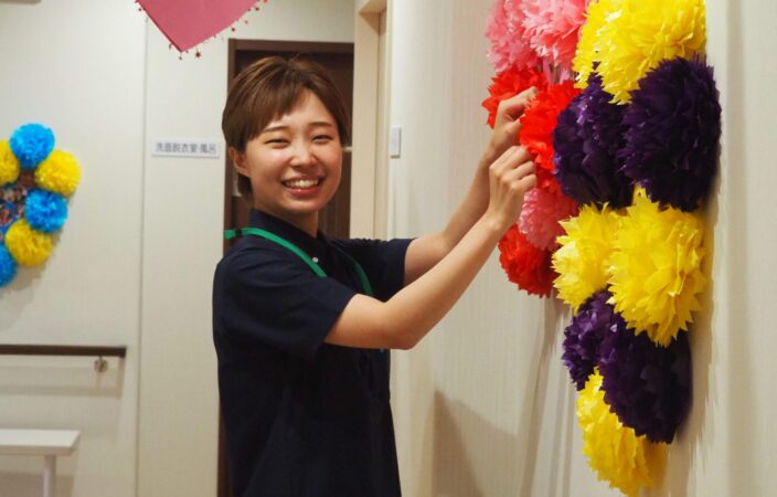 日々の業務では、「通い」の施設ケアに加え、「訪問」でのご自宅支援や「送迎」など、動きのある多彩な業務に関われます。チームでの連携や柔軟な対応力も求められますが介護職としてのやりがいや成長を感じられる環境です。